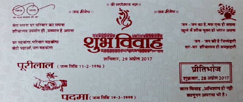 इन दिनों मोदी सरकार के बेटी बचाओ, बेटी पढ़ाओ, स्वच्छ भारत अभियान, शौचालय बनवाने और दहेज प्रथा को खत्म करने के लिए कई मिशन शुरू किए मोदी सरकार के इन मिशन को लोगों का भी भरपूर साथ मिल रहा है| आम जनता सरकार की इस पहल में जमकर अपना साथ निभा रही है| ताजा मामला राजस्थान का है, जहां एक शादी के कार्ड के माध्यम से अनूठी पहल की गई है|